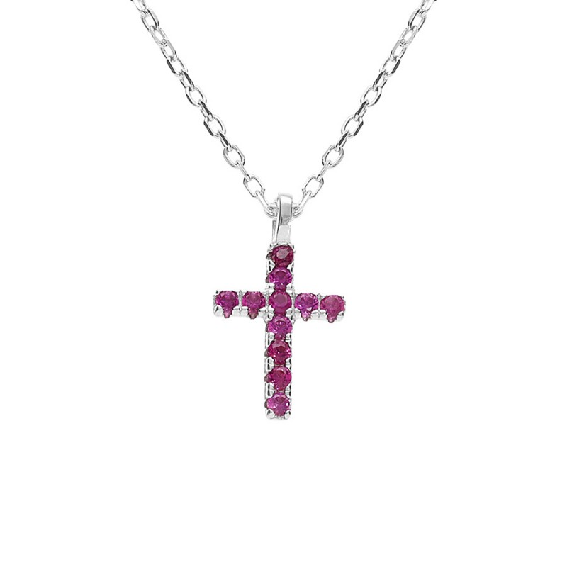 Collier argent 925/1000 rhodié croix oxydes fushia 42+3CM