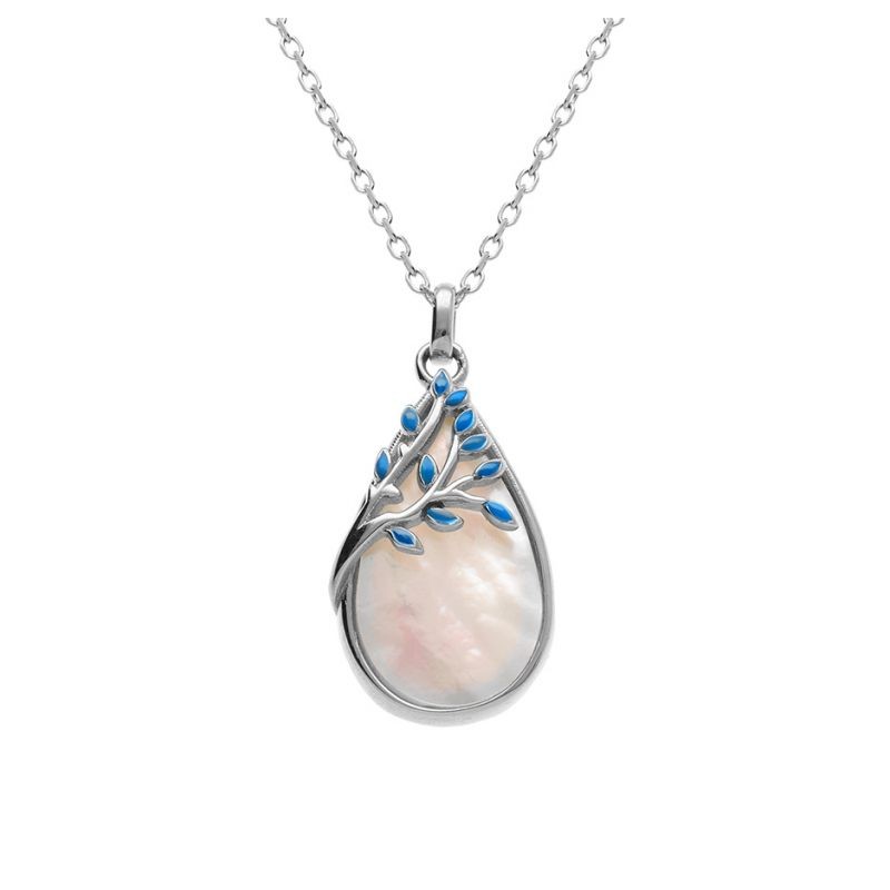 Collier argent 925/1000 rhodié nacre ovale feuilles bleues