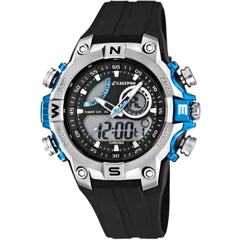 Montre homme plastique chronomètre CALYPSO bracelet noir cadran noir et bleu